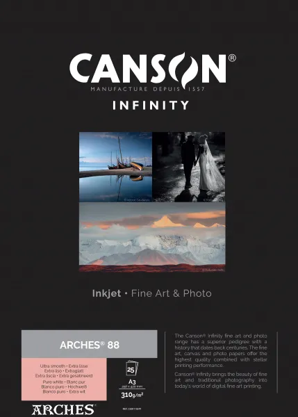 ARCHES® 88 est un prestigieux papier d'impression d'art qui offre aux photographes, aux artistes et aux imprimeurs, la possibilité de créer des impressions digitales de qualité beaux-arts sur un authentique papier ARCHES® pour des éditions limitées ou classiques.