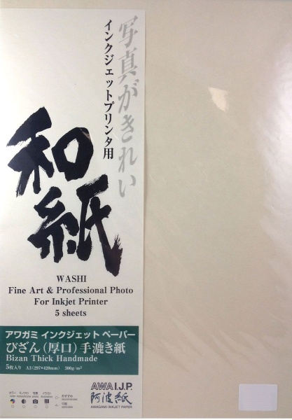 Bizan épais blanc 300 g/m² A3 5f: Le papier BIZAN est fabriqué entièrement à la main avec un procédé traditionnel. Ce papier luxueux a une épaisseur généreuse et ses quatre bords sont frangés. Grâce à sa rigidité, les images imprimées sur ce papier peuvent être exposées sans encadrement.