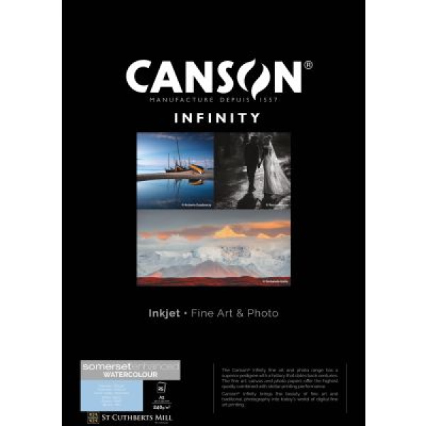 Fabriqué par les artisans papetiers de St Cuthberts Mill en Angleterre, Somerset® Enhanced Watercolour White présente une surface traditionnelle d'aquarelle 'grain fin'. Ce papier 100% coton, fabriqué sur forme ronde et sans azurants optiques, présente une teinte blanc naturel. Le papier est doux au toucher et sa surface texturée offre aux graveurs, aux artistes et aux photographes un aspect pictural à l'impression finale.
