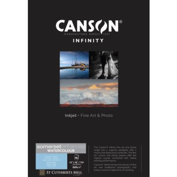 Fabriqué par les artisans papetiers de St Cuthberts Mill en Angleterre, Somerset® Enhanced Watercolour White présente une surface traditionnelle d'aquarelle 'grain fin'. Ce papier 100% coton, fabriqué sur forme ronde et sans azurants optiques, présente une teinte blanc naturel. Le papier est doux au toucher et sa surface texturée offre aux graveurs, aux artistes et aux photographes un aspect pictural à l'impression finale.